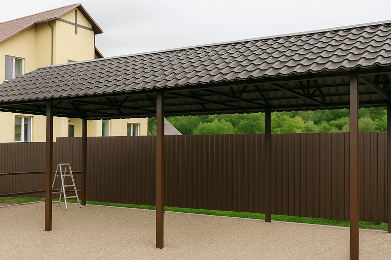 В зависимости от назначения и масштаба проекта мы предлагаем изготовление навесов уличных из профильной трубы, металлокаркаса, поликарбоната или металлочерепицы. При этом учитываются нагрузка, ветровая зона, уклон кровли и особенности основания.